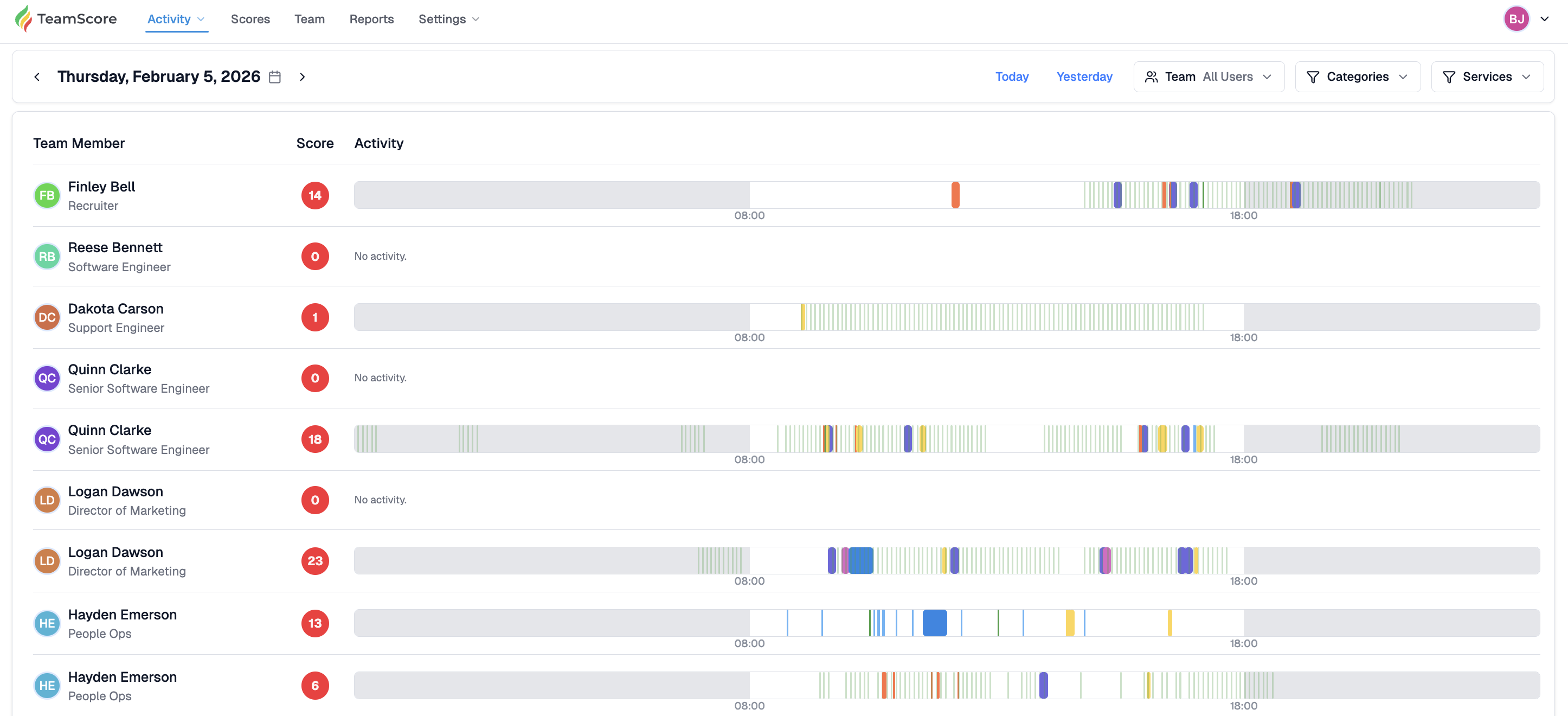 TeamScore's Activity Summary is a key interface for managers and executives to get a snapshot of what their team members have done on any given past date. It aggregates and visualizes user activities, scores, and availability in a straightforward, timezone-aware format.