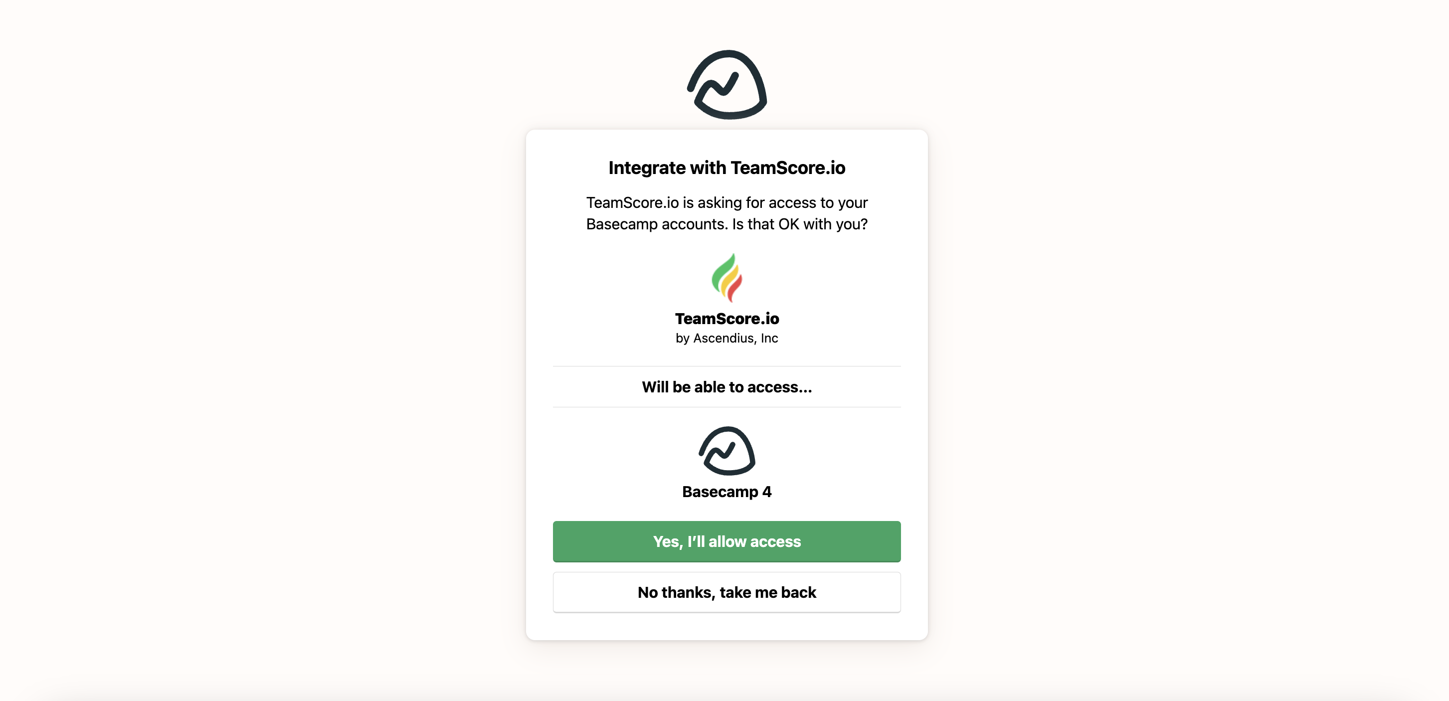 Sign in the Basecamp account you want to connect and approve the requested permissions. Basecamp uses a standard OAuth workflow to allow TeamScore to receive metadata for project activity.