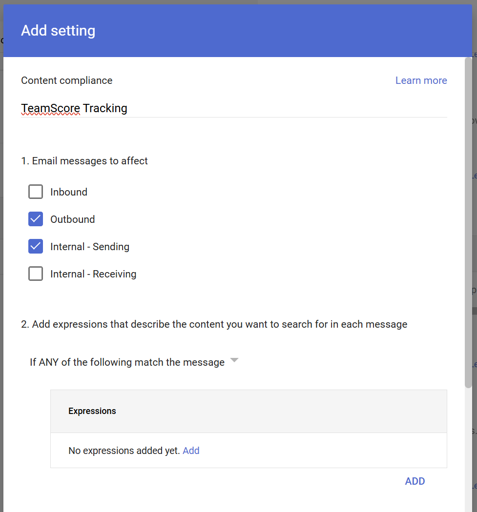 You can give the rule any name you like - we have called it "TeamScore Tracking" in the screenshot below. Then choose "Outbound" and "Internal - Sending". This ensures you're only sending TeamScore the emails your team are sending - whether they are going to external recipients or colleagues only.