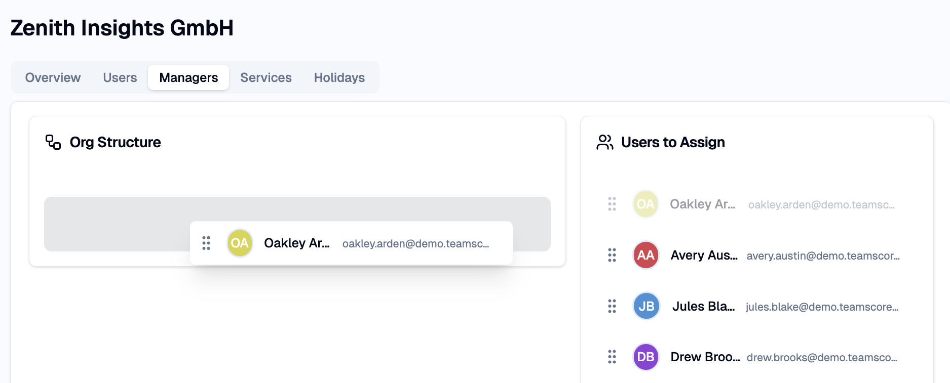Assigning manager relationships defines how your organization is structured inside TeamScore. These relationships determine reporting lines, access levels, and which users appear in each manager's dashboards. Setting this up ensures the reporting structure in TeamScore matches your organization accurately.